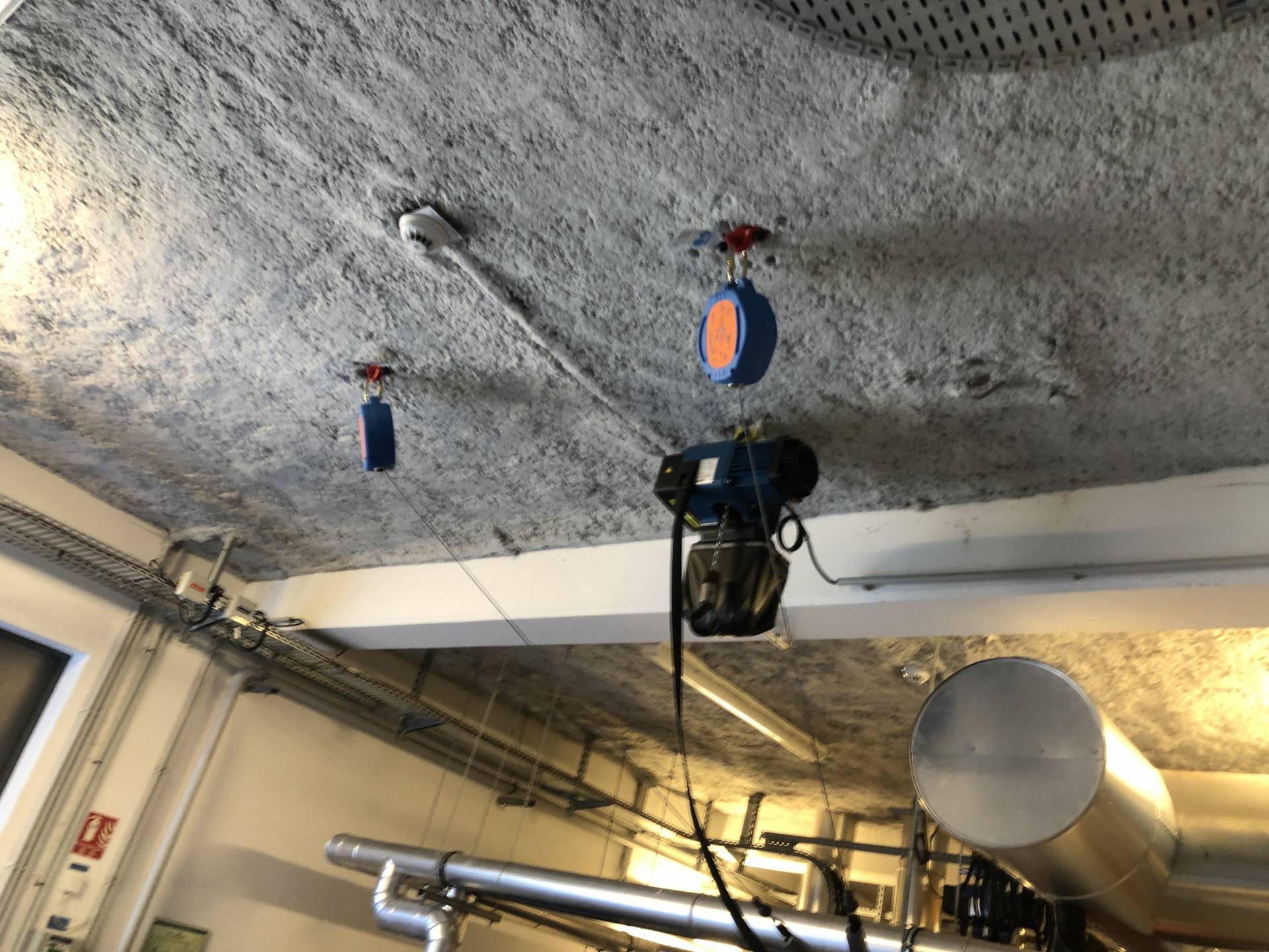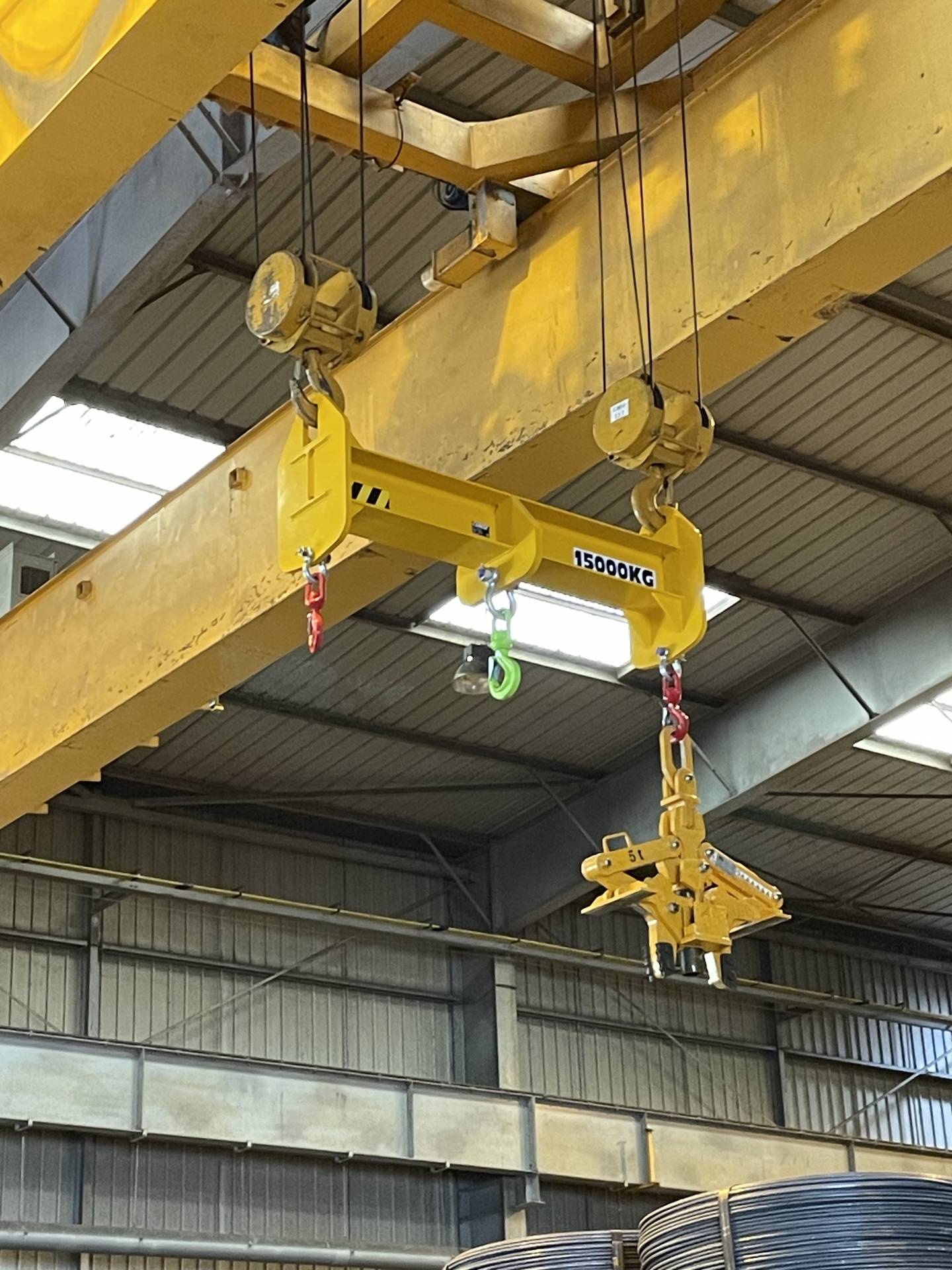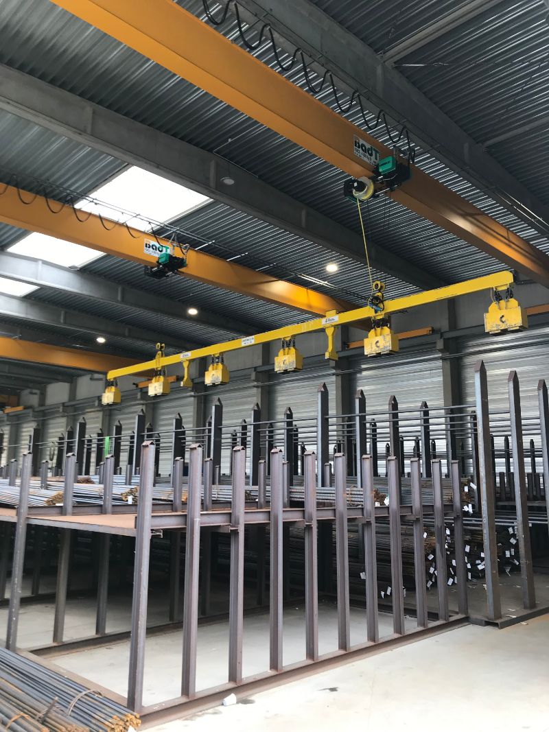 Mise en place d'un palonnier aimant sur deux ponts roulants BADT avec palan à cable Verlinde VT en Seine Maritime (76)