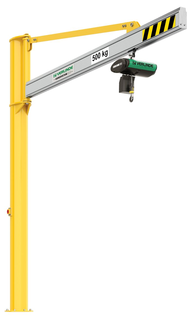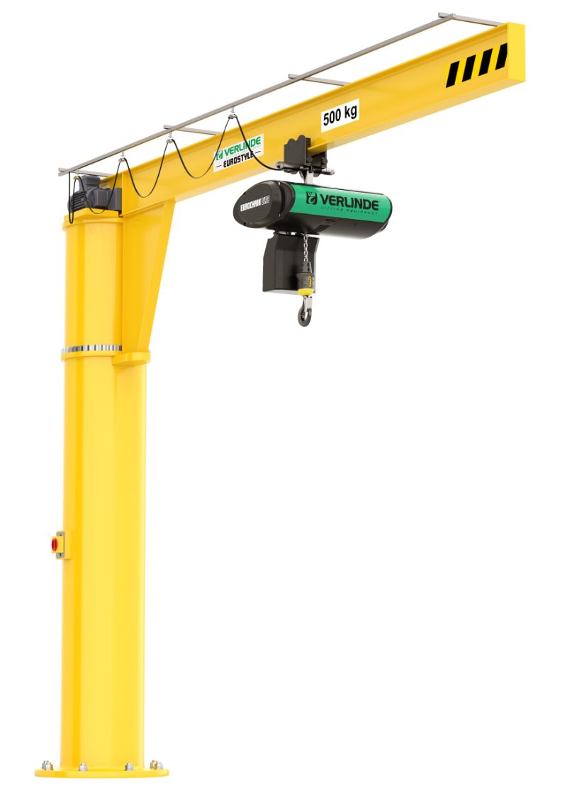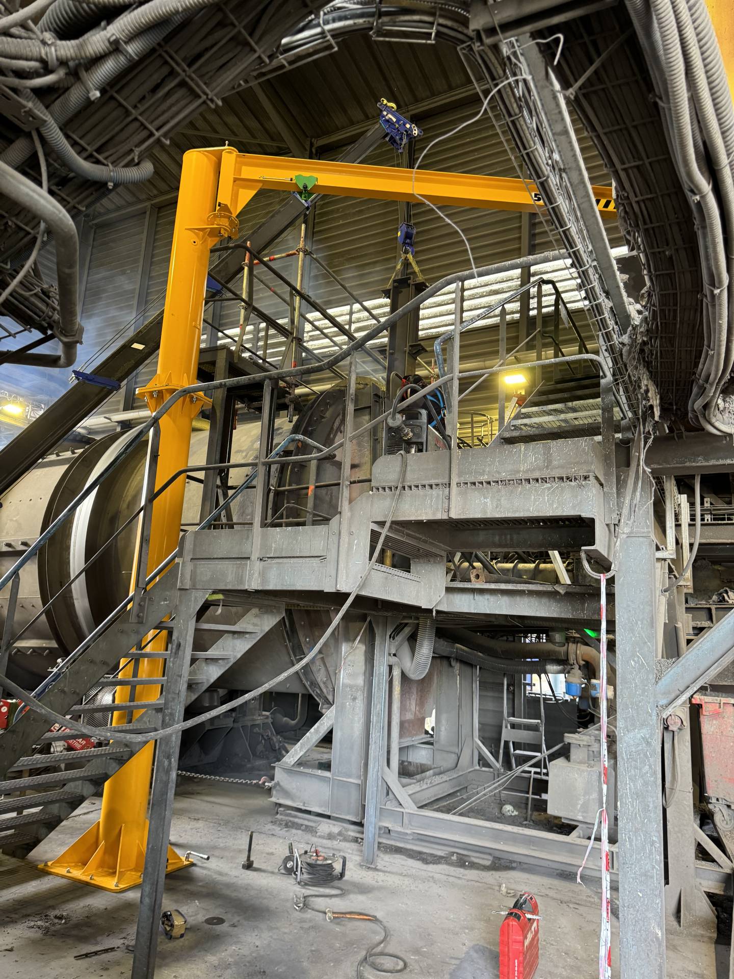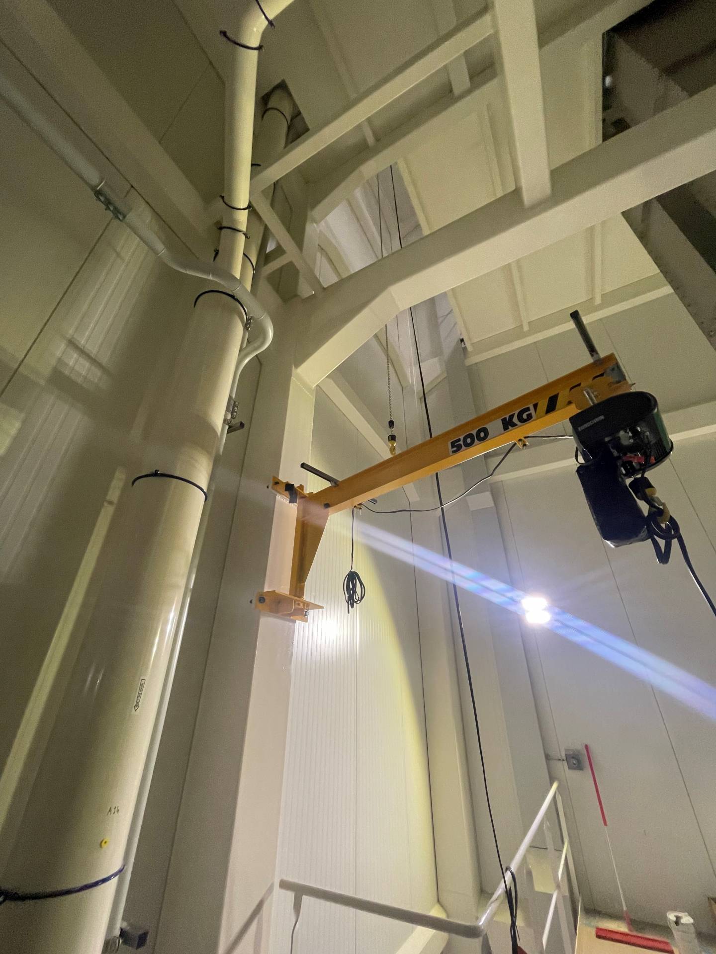 Mise en place d'une potence sur fut avec bras télescopique équipe d'un palan électrique à chaîne Verlinde VX en Normandie (76)